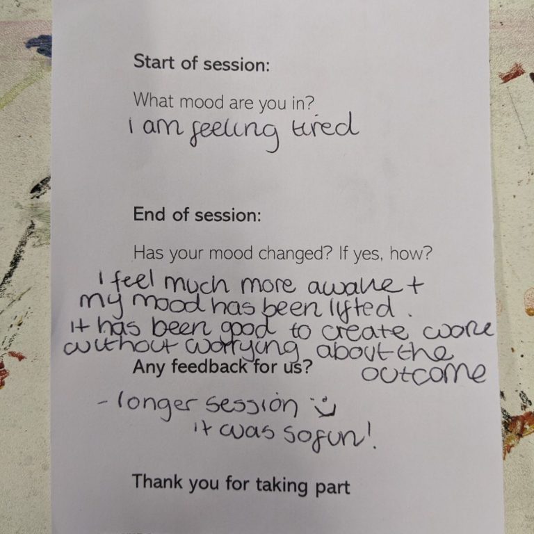 Student feedback following the sessions described reduced anxiety and stress, remarking on the pleasure of speaking with their peers and creating art in a low-pressure environment. In answer to the question “has your mood changed?”, one student wrote “feeling calmer and enjoyed the social time in the morning – very nice start to the day.”