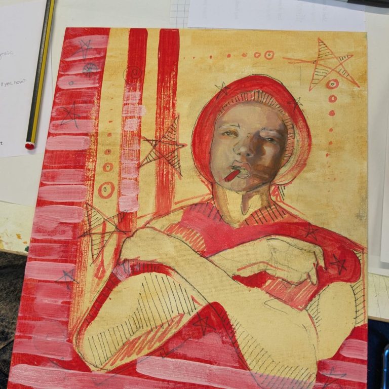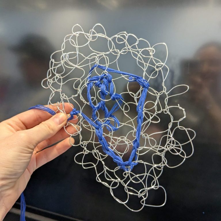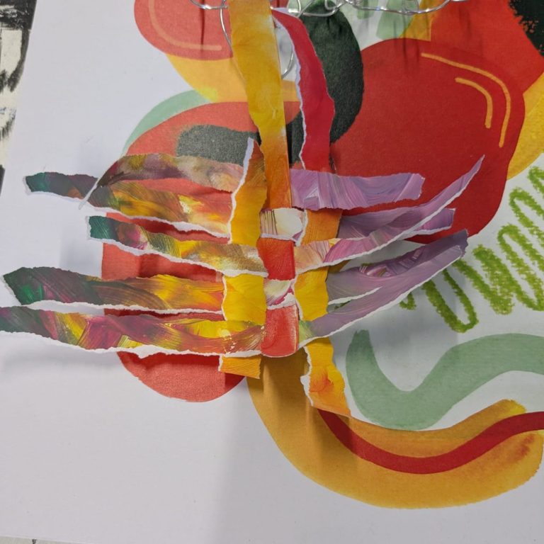 These workshops were delivered in collaboration with other socially engaged artists; BA students at Salford University requested art workshops on the theme of health and wellbeing. Our proposal focused on poor mental health, as this tends to be prevalent among students. Building on my concept of reworking previous artworks, we encouraged students to bring their unsuccessful or unwanted work to adapt in the session, aiming to reduce stress and perfectionism while promoting a culture of sustainability. The facilitators also brought a selection of our own previous artwork for students who did not want to destroy their own. We designed the workshop space to include paints, thread, wire, and collage materials, each spread over different stations. This allowed students to select their preferred materials and organically split the group into smaller sections to facilitate comfortable connections.